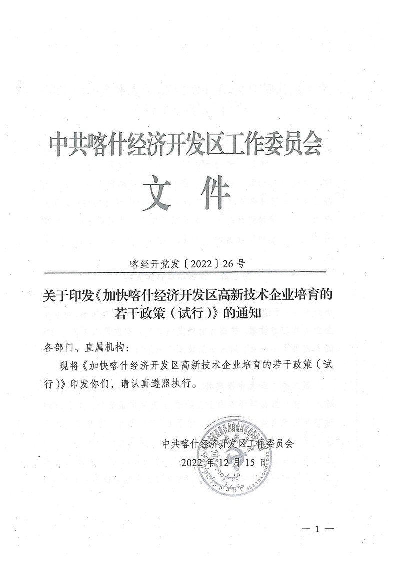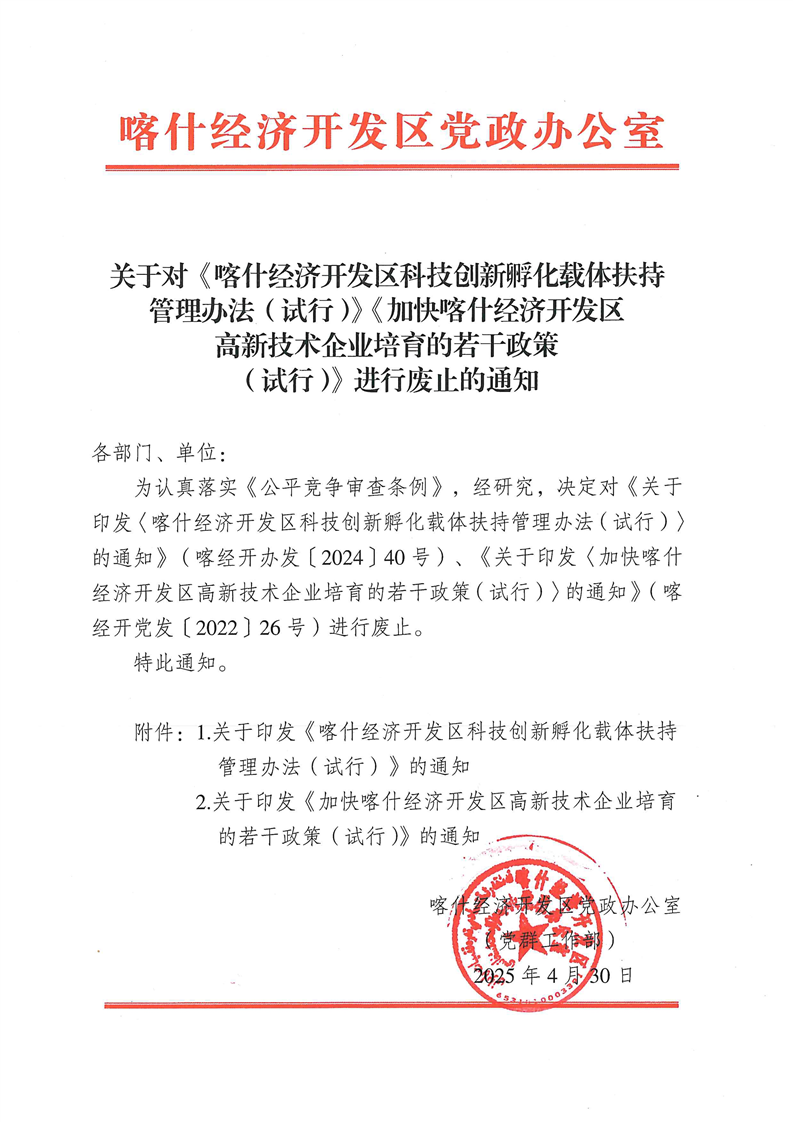 关于对《喀什经济开发区科技创新孵化载体扶持管理办法(试行)》《加快喀什经济开发区高新技术企业培育的若干政策(试行)》进行废止的通知