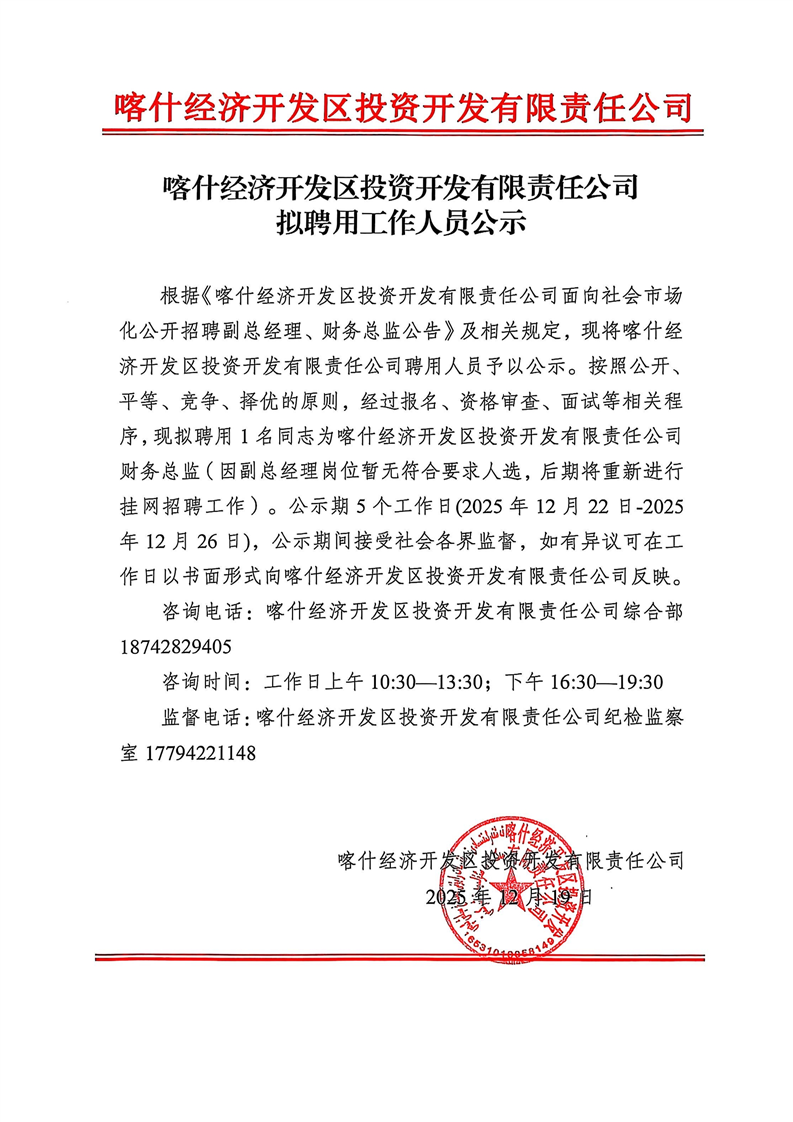 喀什经济开发区投资开发有限责任公司拟聘用工作人员公示