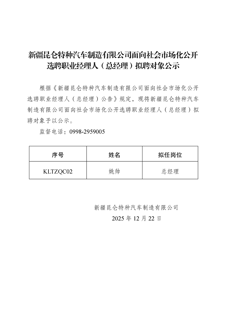 新疆昆仑特种汽车制造有限公司面向社会市场化公开选聘职业经理人(总经理)拟聘对象公示