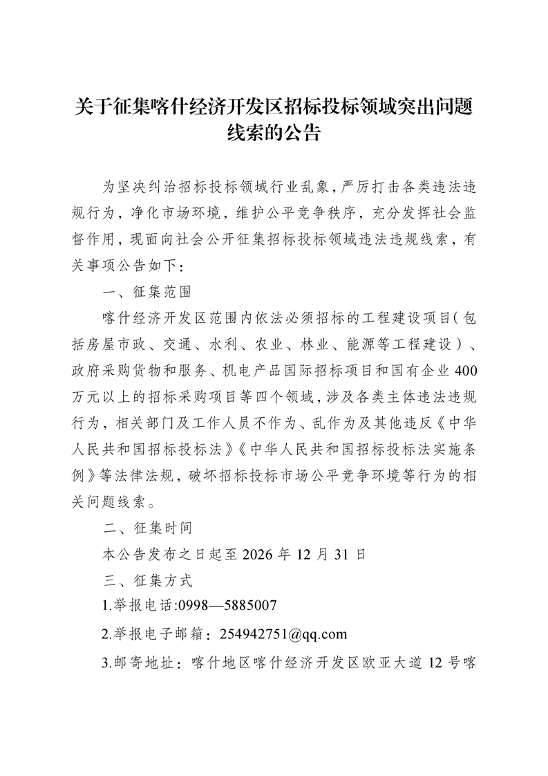 关于征集喀什经济开发区招标投标领域突出问题线索的公告