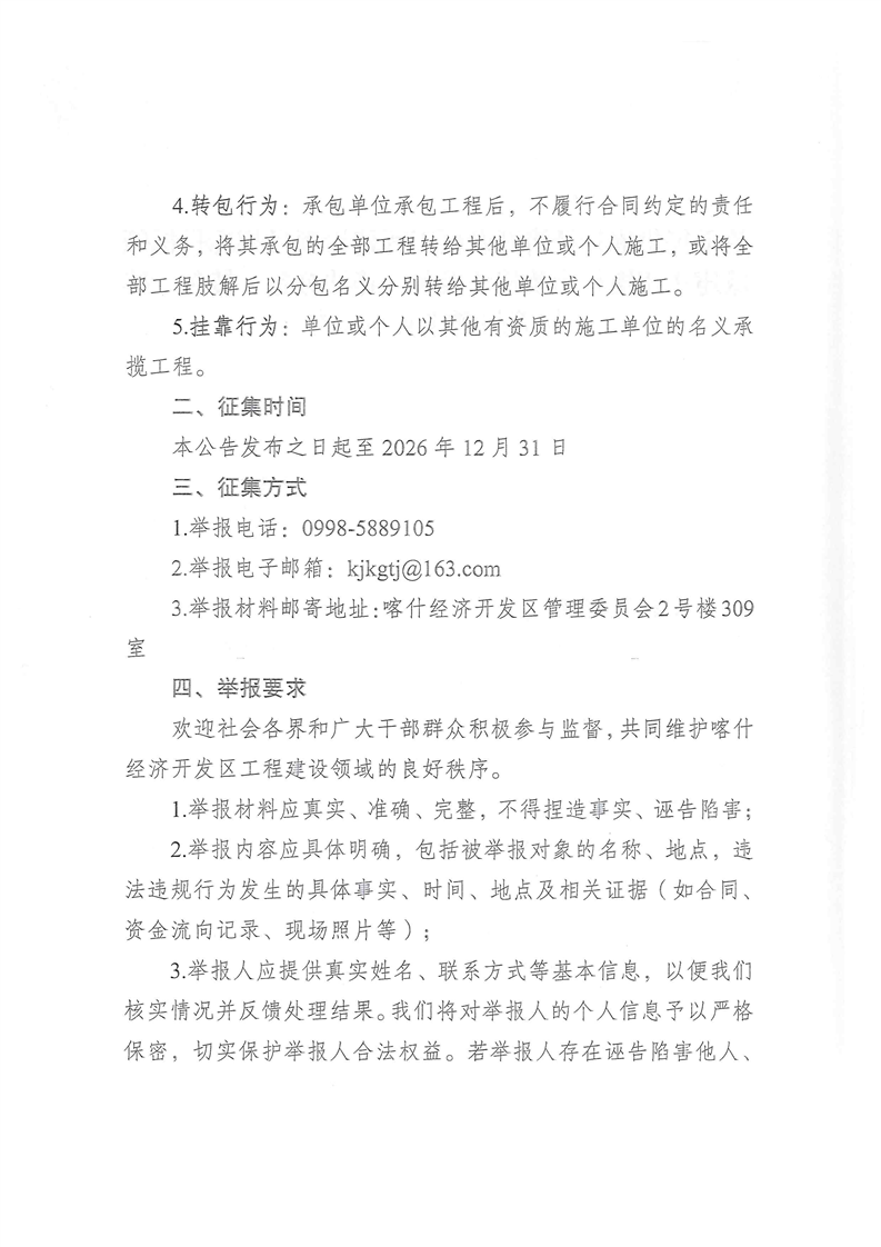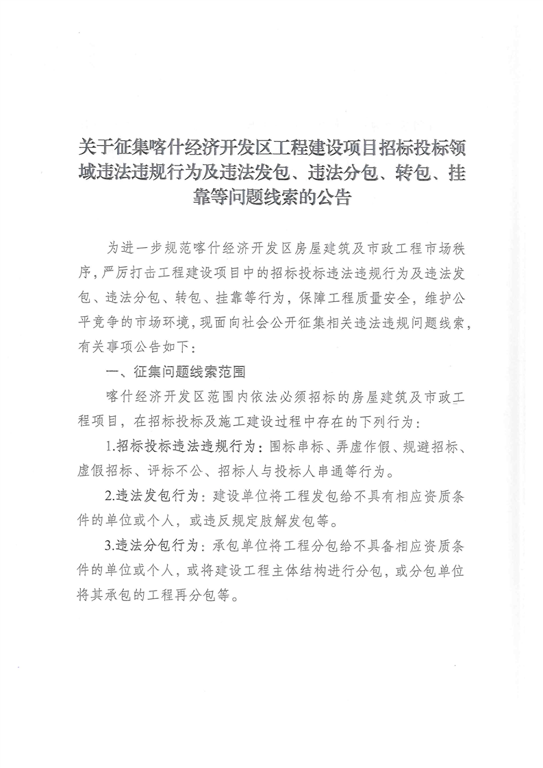 关于征集喀什经济开发区工程建设项目招标投标领域违法违规行为及违法发包、违法分包、转包、挂靠等问题线索的公告