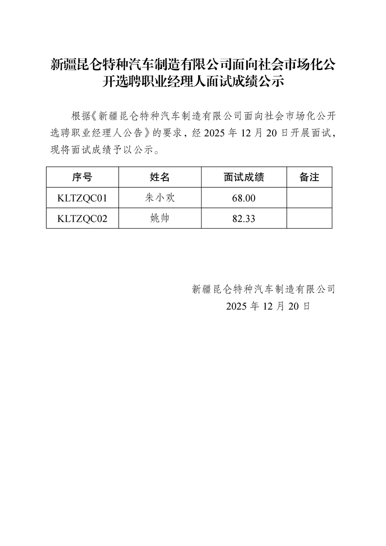 新疆昆仑特种汽车制造有限公司面向社会市场化公开选聘职业经理人面试成绩公示