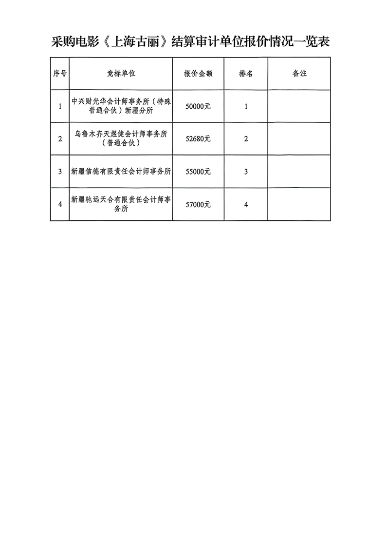 喀什经济开发区投资开发有限责任公司聘请《上海古丽》项目结算审计服务比价结果公示