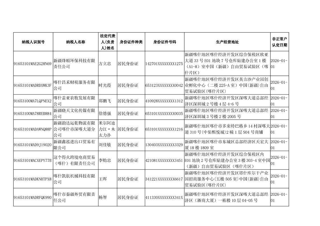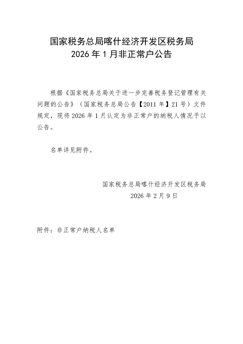 国家税务总局喀什经济开发区税务局2026年1月非正常户公告