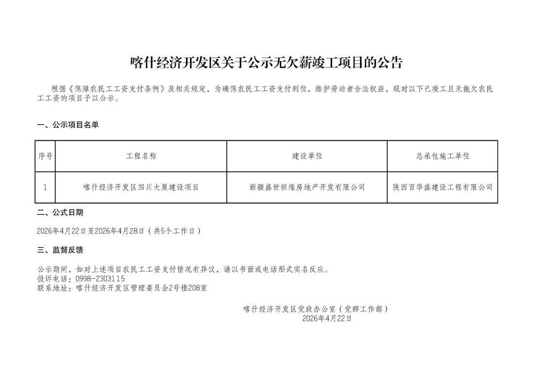 喀什经济开发区关于公示无欠薪竣工项目的公告