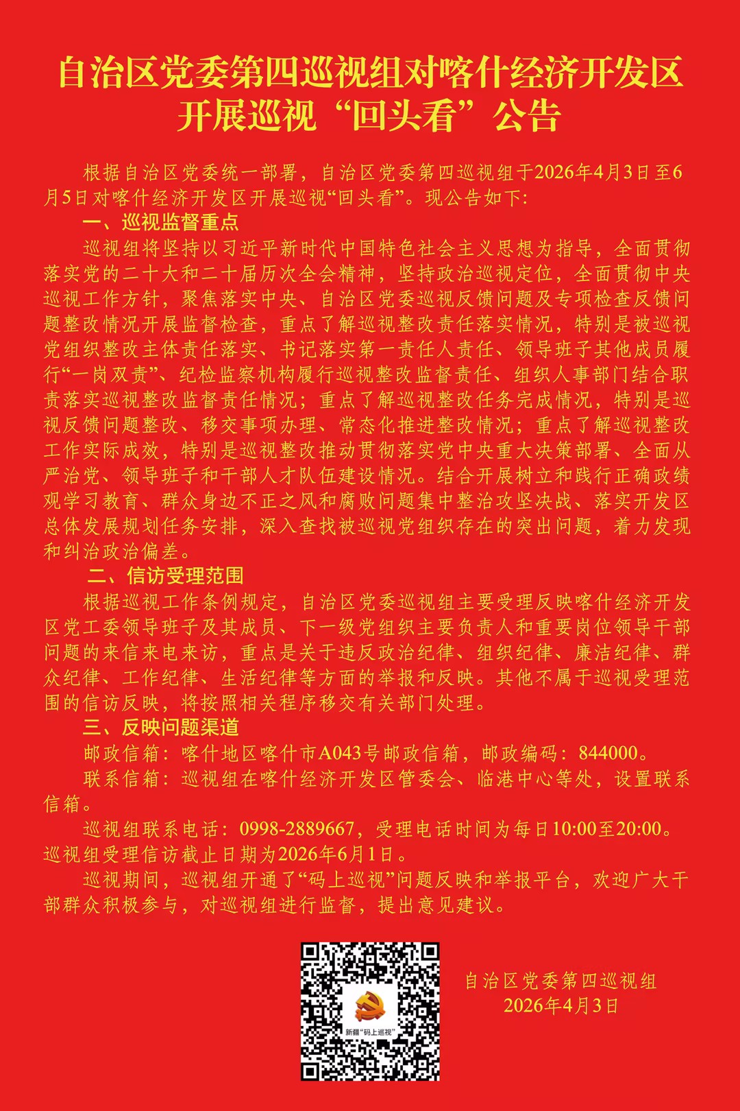 自治区党委第四巡视组对喀什经济开发区开展巡视“回头看”公告